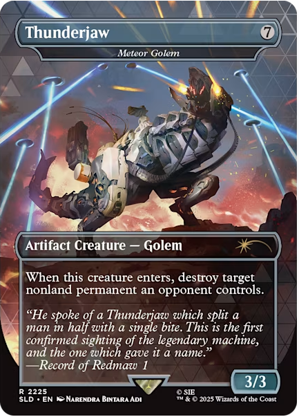 Oltre a una nuovissima carta Magic che raffigura la più grande cacciatrice di macchine del mondo, il drop Secret Lair x Horizon: Into the Forbidden West presenta anche le impressionanti macchine colossali per cui la serie è nota. Ottenete la vista di un Collolungo con Lungosguardo, gioca un Colosso di Blightsteel come l’antica macchina da guerra “FAS-BOR7 Horus” o un Golem Meteora come “Divoratuono”. E con il Fendianima di Tarrian e l’arco “Ira di Regalla” che Aloy ha reclamato al Kulrut, puoi essere certo che la Salvatrice di Meridian sarà completamente equipaggiata per il viaggio nell’Ovest Proibito.